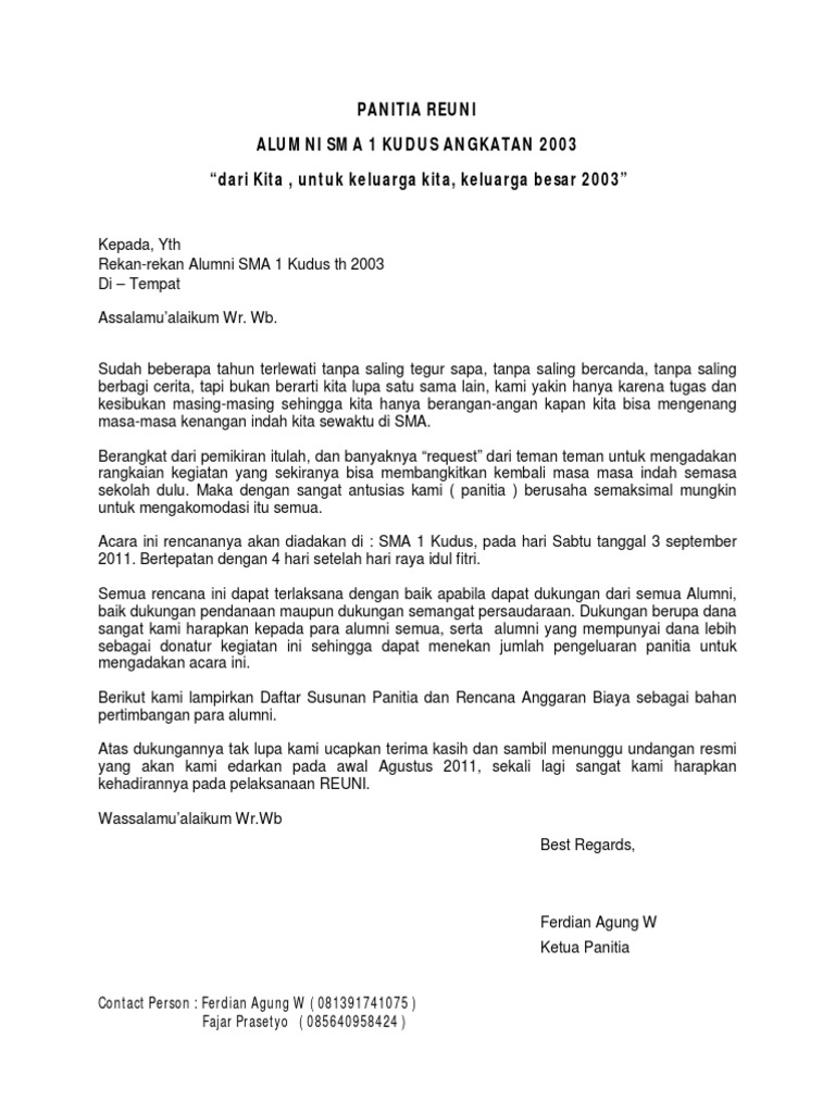 Proposal Reuni Smp Pdf from imgv2-1-f.scribdassets.com Namun, jika acara reuni dilangsungkan diluar sekolah, seperti di gedung, restoran, dan sebagainya, maka anda harus membuat surat permohonan izin tempat untuk melangsungkan acara reuni tersebut. Jul 21, 2021 · jika acara reuni diadakan di aula sekolah, maka perlu surat izin tempat dari kepala sekolah.